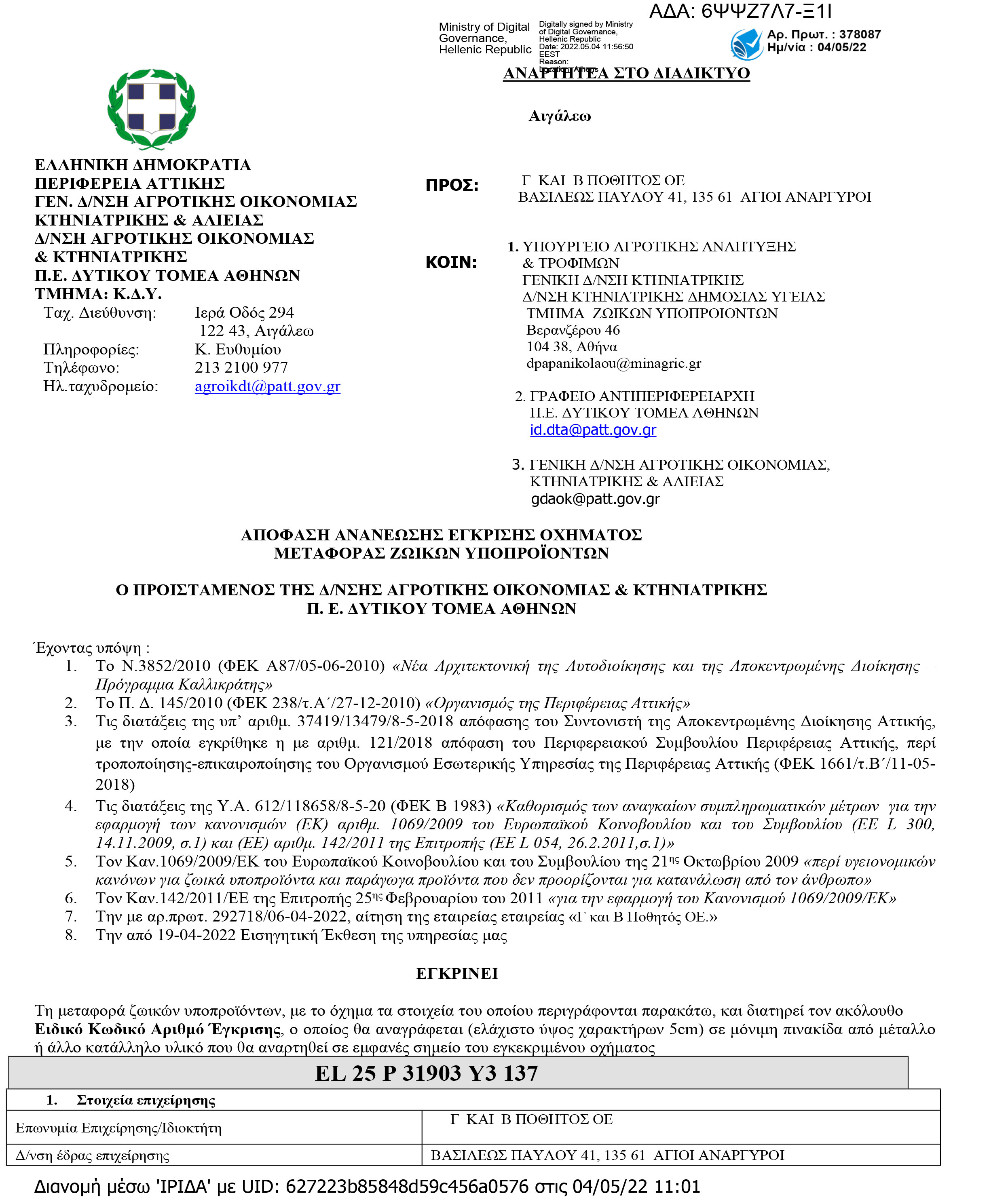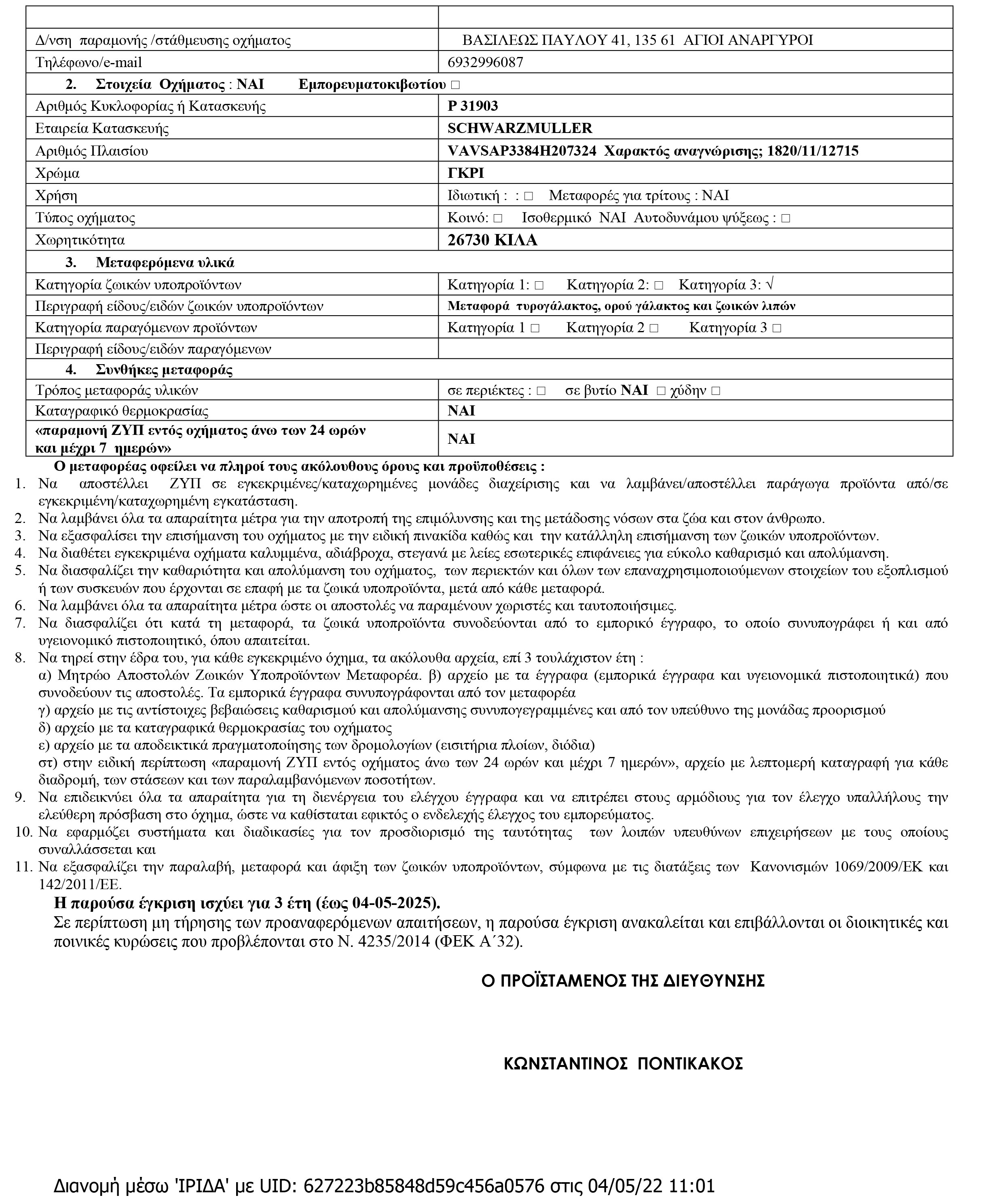 Έγκριση Μεταφοράς Ζωικών Υποπροϊόντων & Παράγωγων Προϊόντων